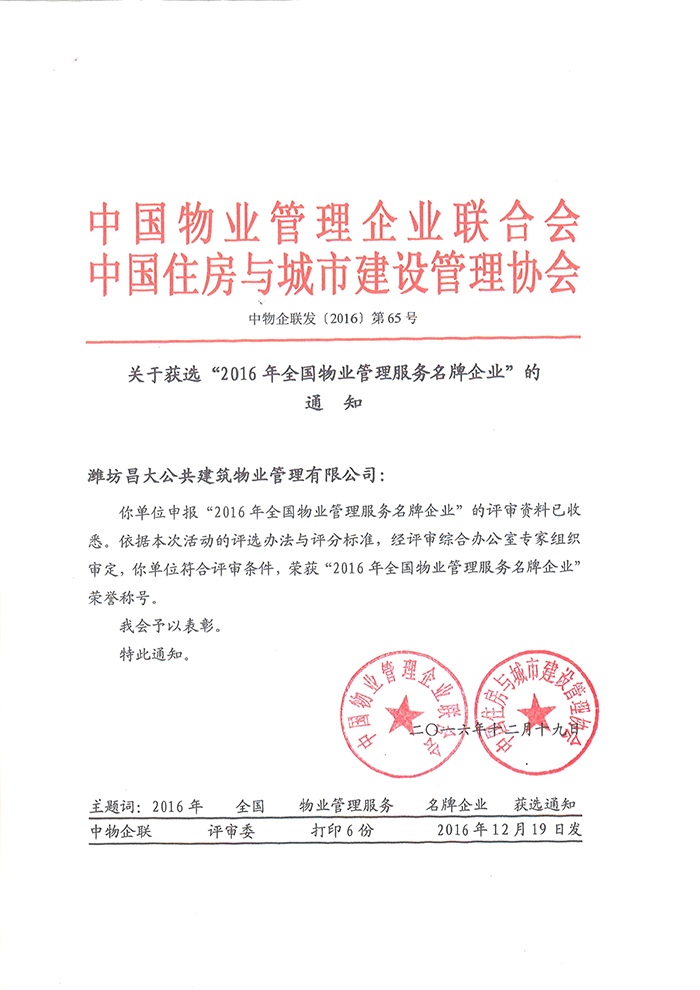 2016年度全國物業(yè)管理服務名牌企業(yè)