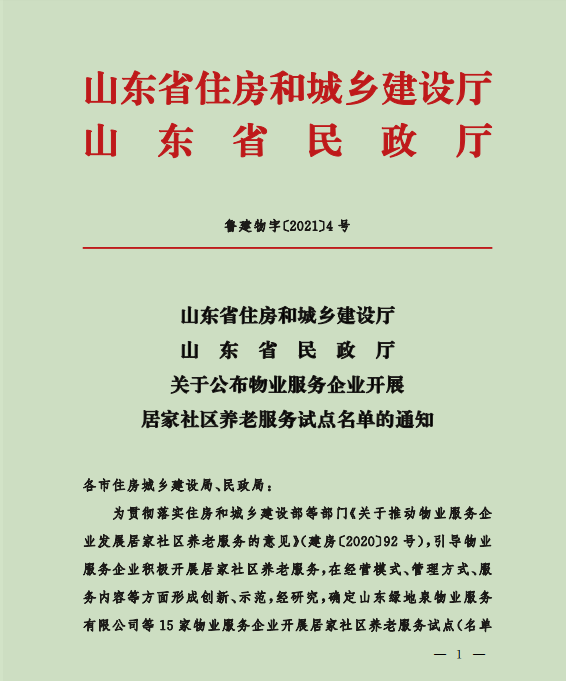 2021年9月6日,山東省住房和城鄉(xiāng)建設廳、山東省民政廳聯(lián)合公布了關于物業(yè)服務企業(yè)開展居家社區(qū)養(yǎng)老服務試點名單,我公司在首批試點名單之列。 ......